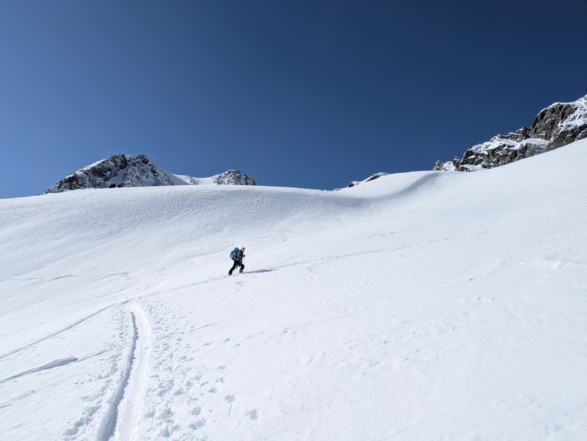 Wir arbeiten uns wieder Schweiß vergießend durch den Firn nach oben.