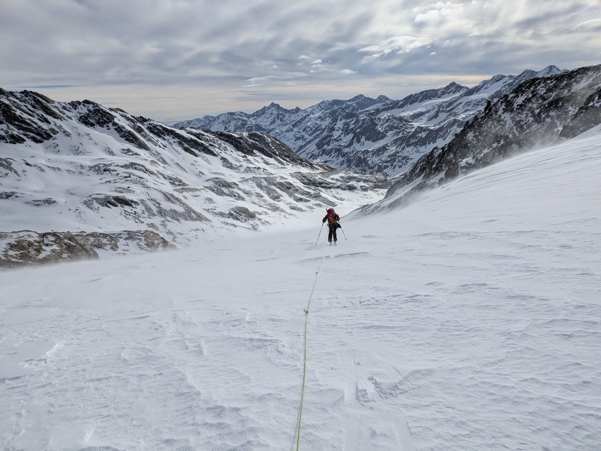 Gipfel wir heute angehen möchten; die Entscheidung fällt auf den Längentaler Weißen Kogel. Auf gut angelegter Spur kommen wir unschwierig voran auf den Gletscher. Endlich geht die Sonne auf und spendet uns hier oben etwas angenehmere Temperaturen.