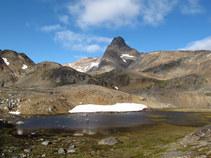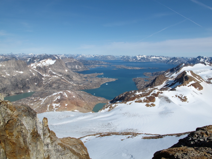 Blick zurück zum Polhelms-Fjeld. Links am Berg die markante Schulter, die wir erreicht