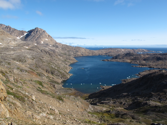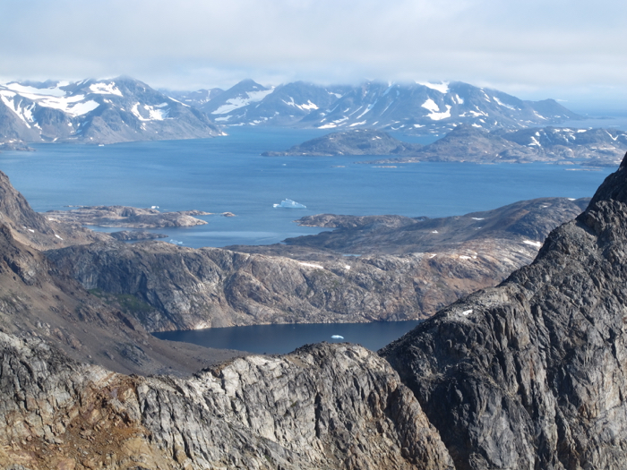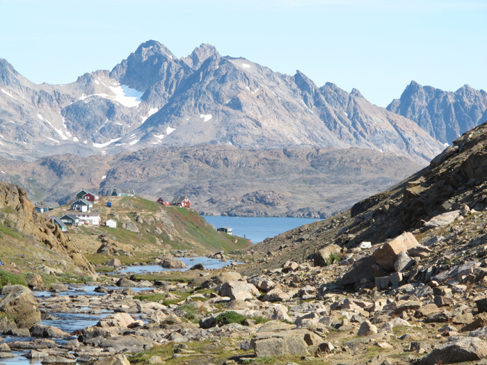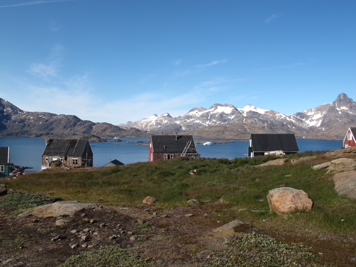 von Tasiilaq vor dem gut geschützten Kong-Oscars-Havn. Neben der Ortschaft sehen wir auch die nächsten Ziele am Horizont: Zum einen