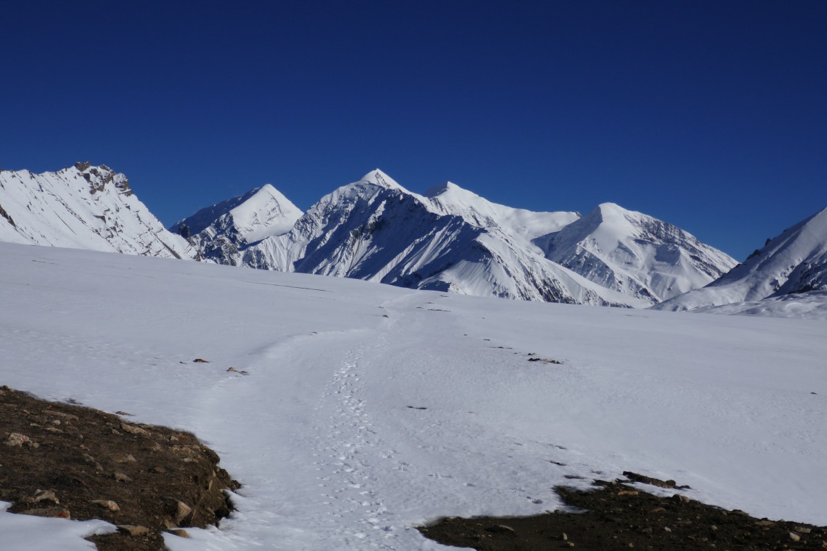 Nach Osten hin zeigt sich über dem Plateau der Sadache Himal. Mittig ist der Doppelgipfel des Tashikang zu sehen, links davon der Tasartse.