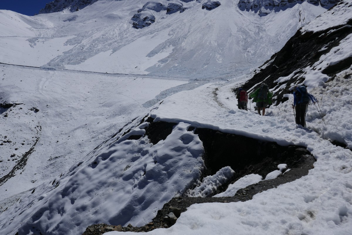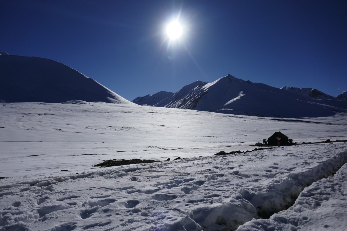 die Richtung einblicken, aus der wir eigentlich plangemäß hierher gekommen werden. Das Tal zum Mu La ist komplett verschneit -