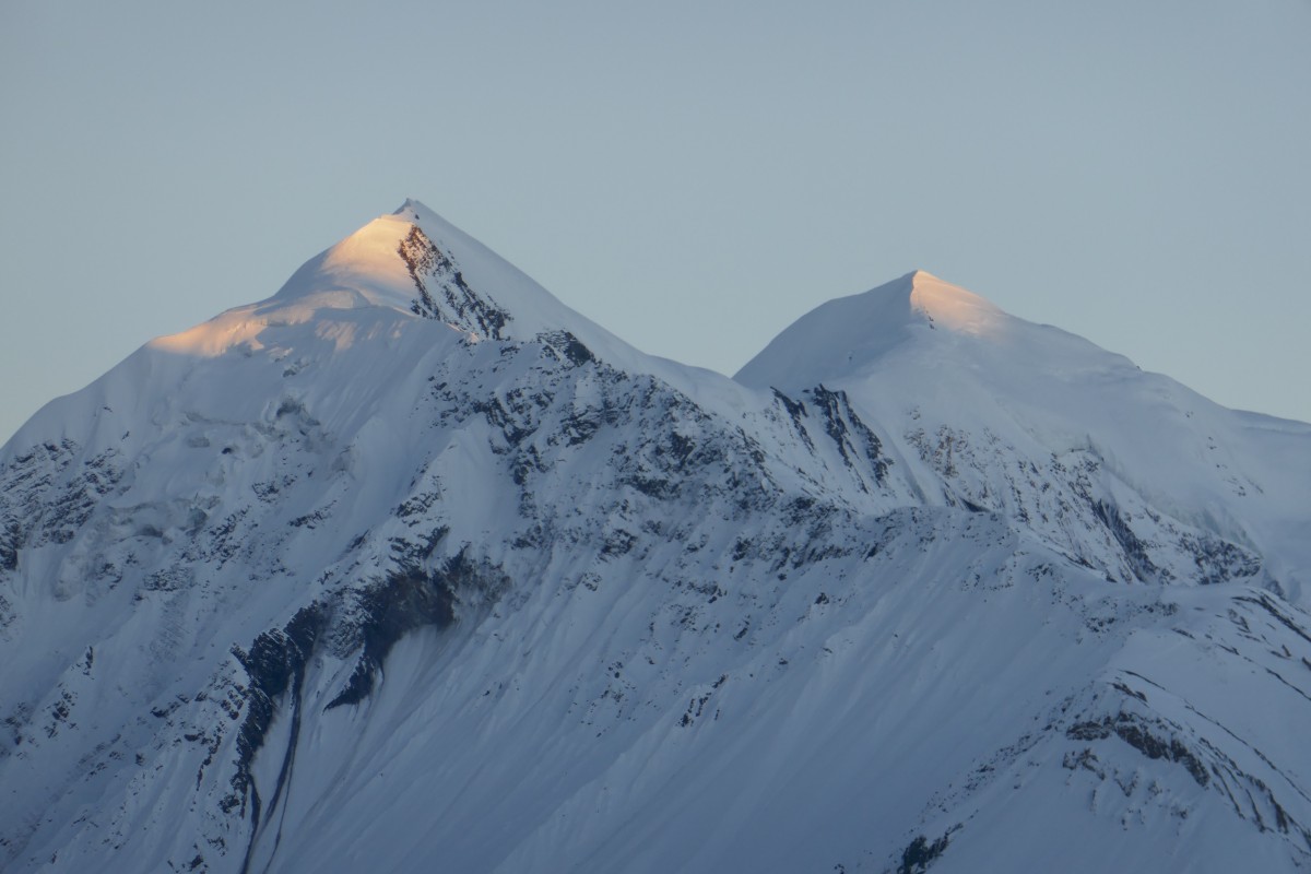 Im Abendlicht zeigen sich die Spitzen des Doppelgipfels des Tashikang.