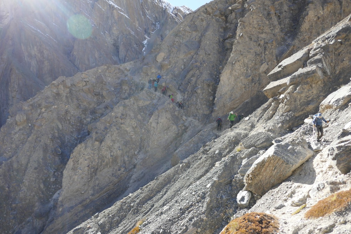Die Muli-Karawane hingegen zieht mit dem größten Teil der Küchenausrüstung und anderer entbehrlicher Ausrüstung wieder zurück Richtung Chharkabot.