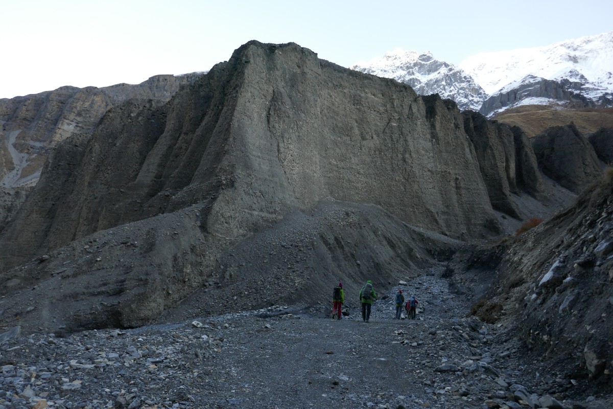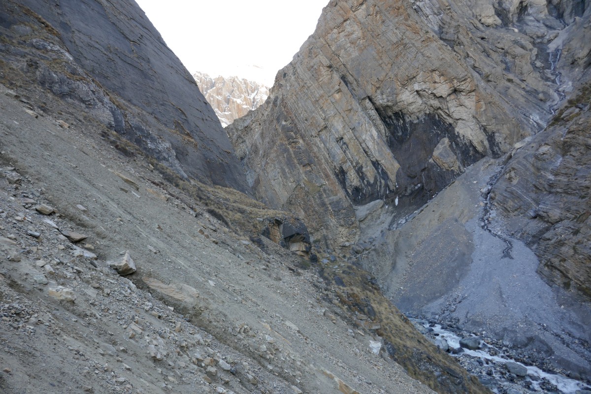Schließlich kommen wir nach einiger Mühe am Ende des Bheri Kholas an; die schmale Schlucht in Südost-Ausrichtung, durch die wir herabgekommen sind,
