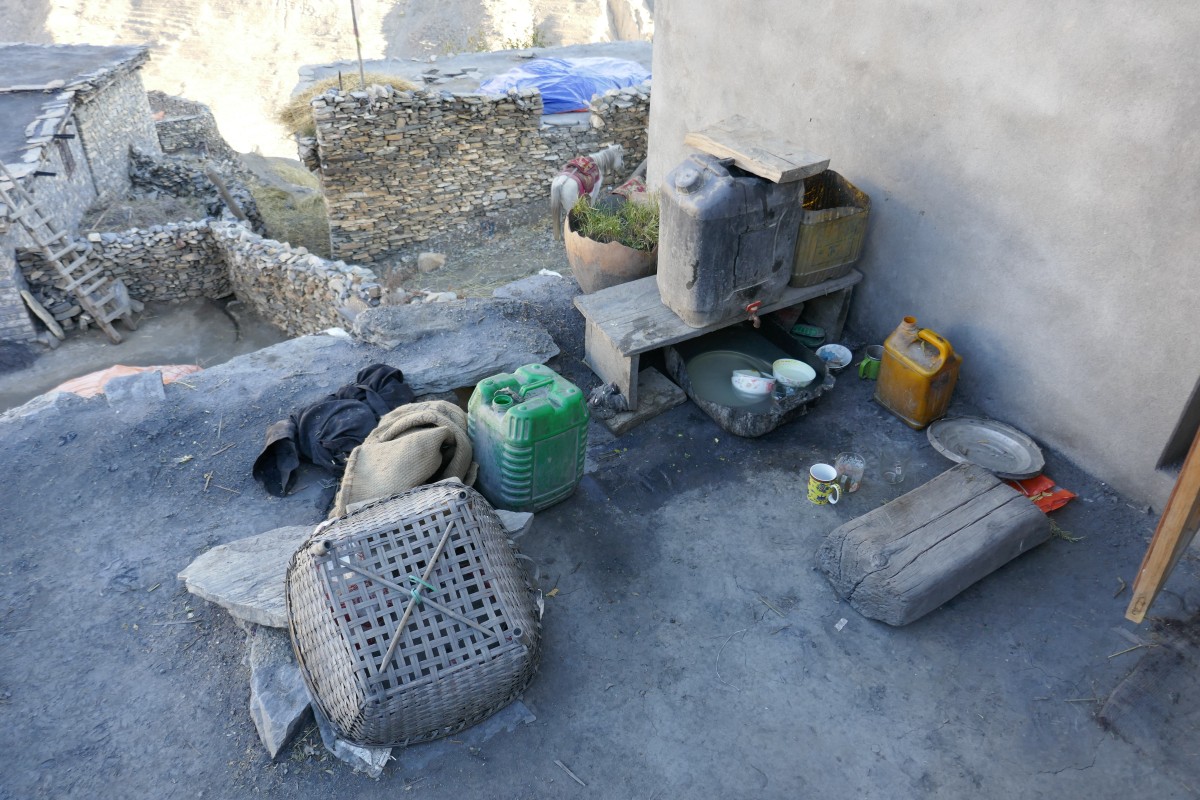 Am nächsten Morgen fotografiere ich das "Spülbecken" unserer Unterkunft: Im Freien, ohne fließend Wasser. Letzteres muß vom Dorfbrunnen geholt werden und über eine