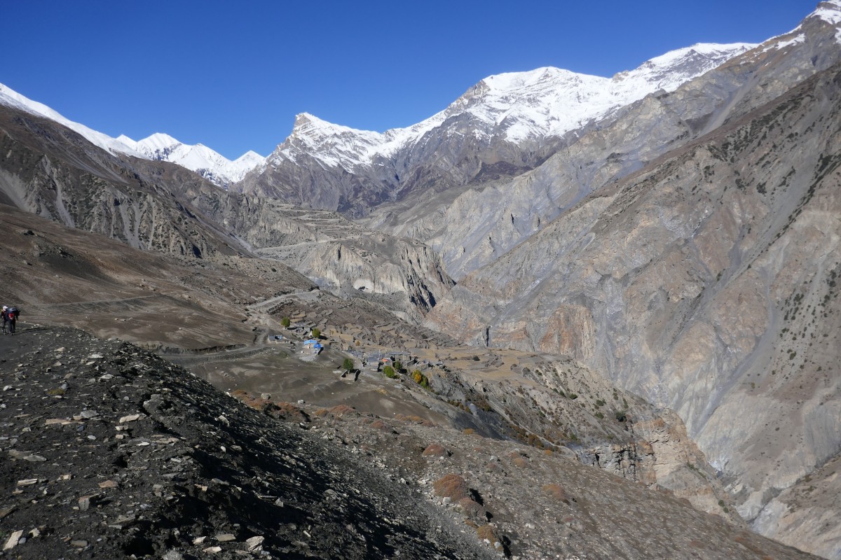 In der Vergrößerung sind unter der Schneegrenze die Serpentinen des Weges zu erkennen. Mukhtinath als Pilgerort liegt direkt
