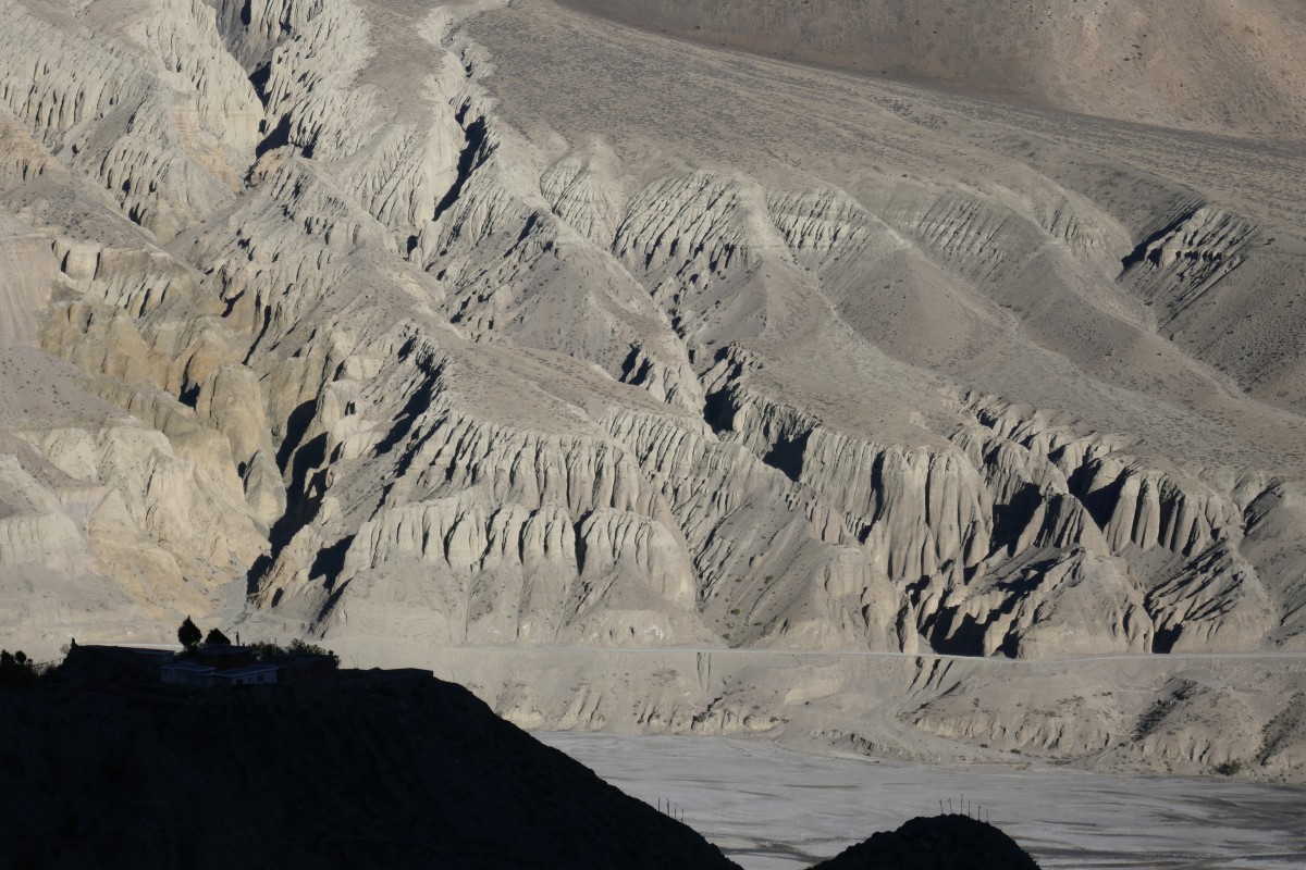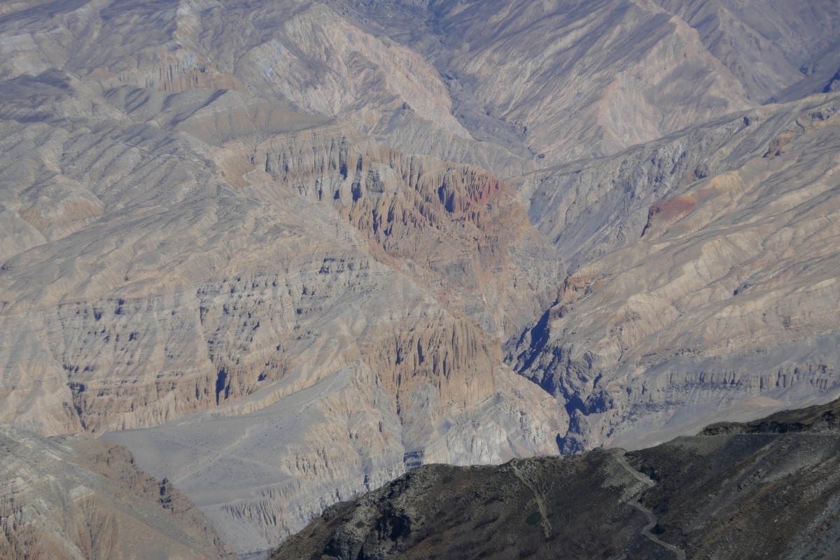 Im Kali-Gandaki-Tal, welches wir ab dem Paß gut von oben her einsehen können, zeigen sich die vertrauten Erosionsstrukturen.