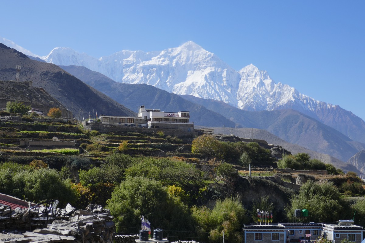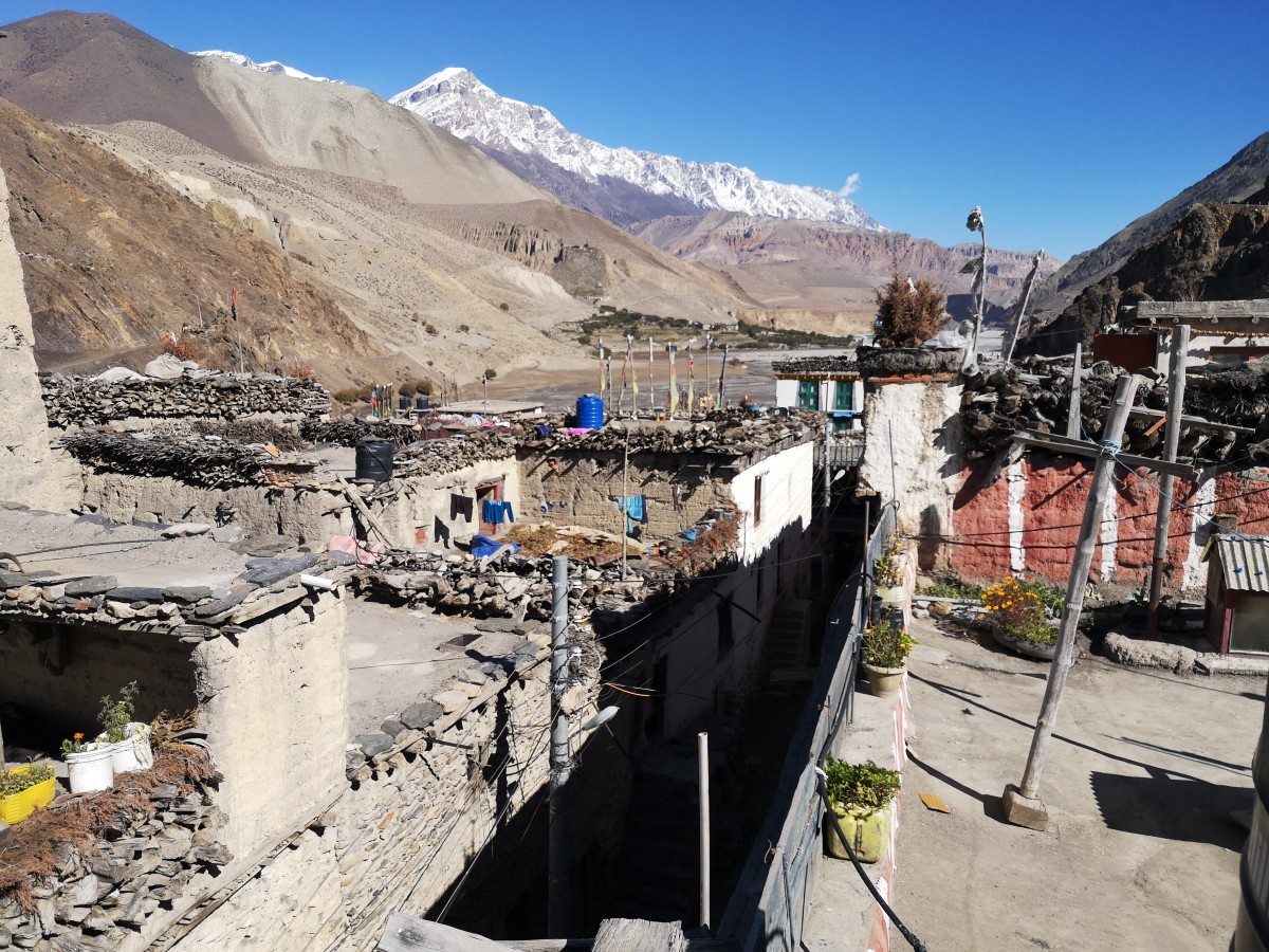 Über den Dächern von Kagbeni zeigt sich im Süden der Nilgiri.