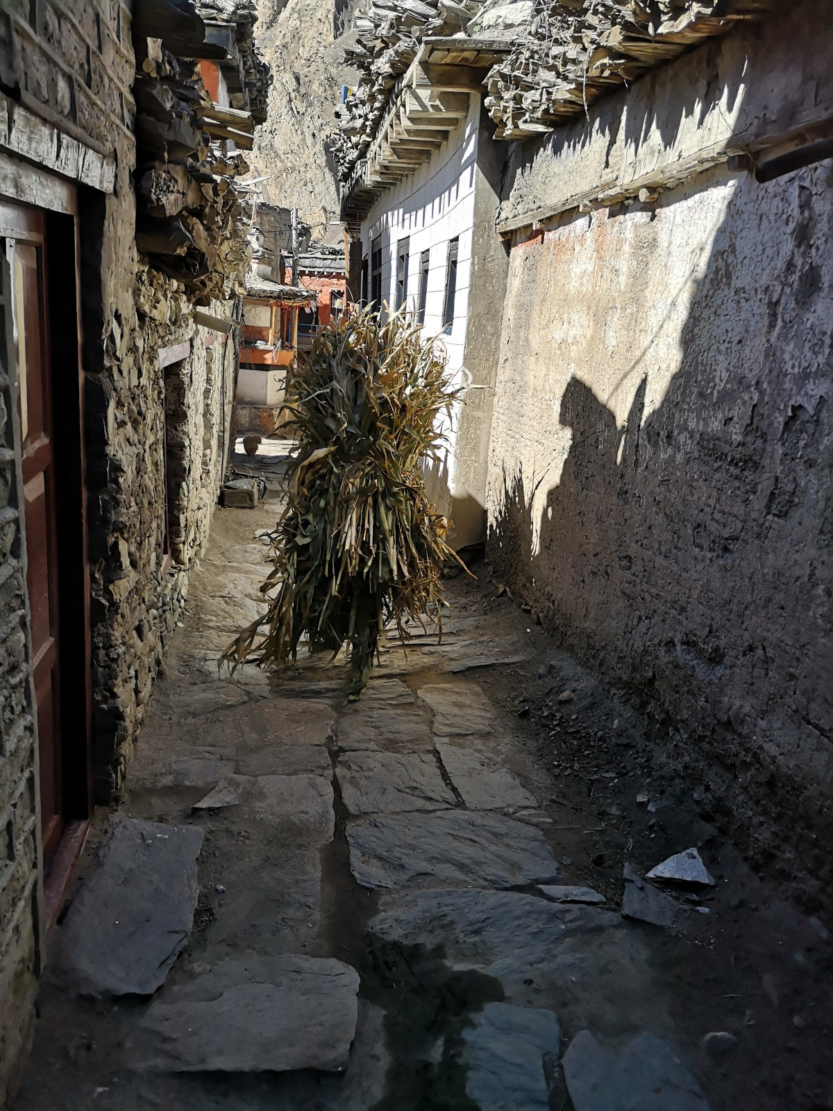 Ein Bündel Maisstroh wird durch die engen Gäßchen getragen; wahrscheinlich wird es Kühen oder Ziegen vorgeworfen.