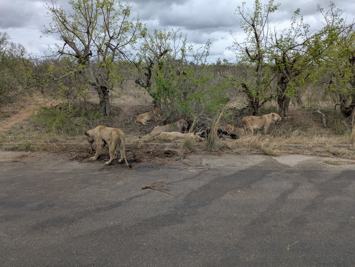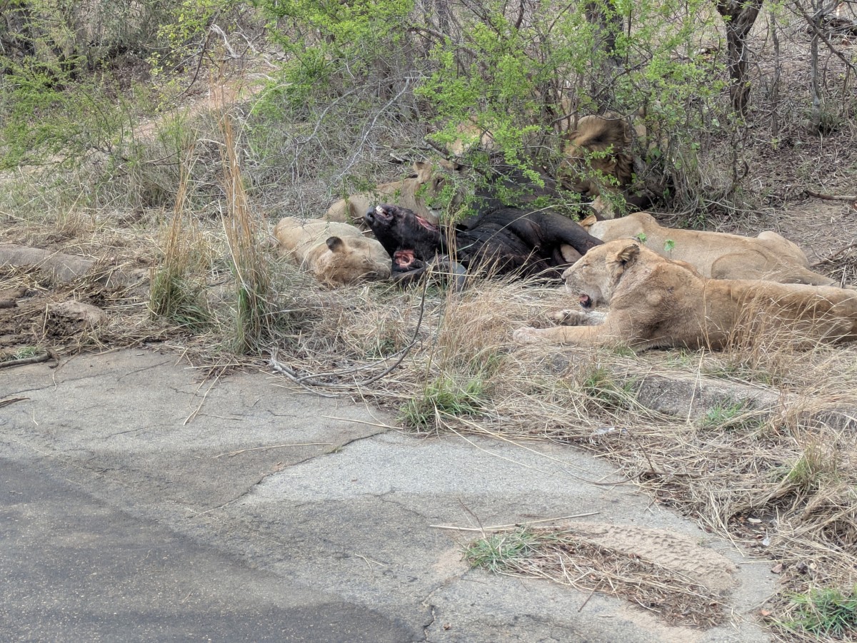 ...und wir werden wahrlich nicht ettäuscht! Noch vor der eigentlichen Eingangsstation zum Park haben wir das unverschämte Glück, sieben Löwen bei ihrem Festmahl an einem erlegten Büffel zu beobachten. Der Riß liegt direkt am Straßenrand.