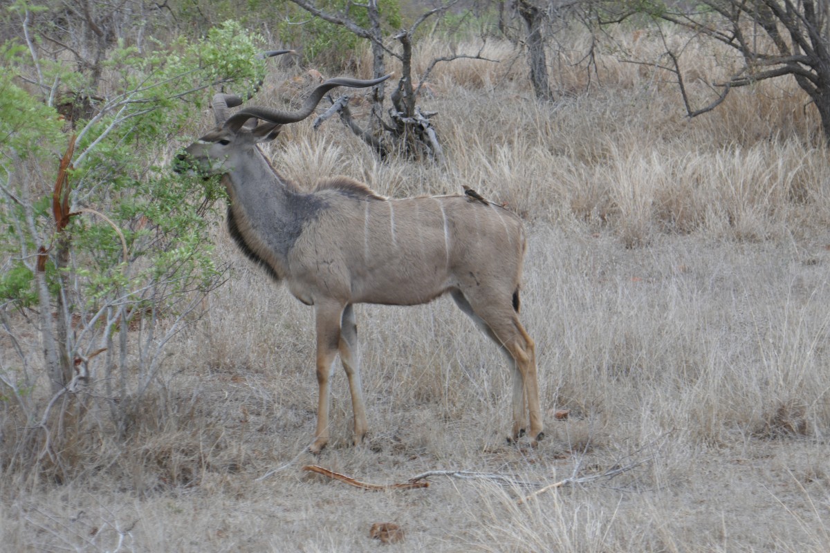 Nachdem wir uns an der Szene sattgesehen haben, geht es weiter in den Park. Uns ist klar, daß wir mit hoher Wahrscheinlichkeit schon das Wildeste gesehen haben, was uns die nächsten drei Tage widerfahren wird - einen Haupttreffer eines speisenden Löwenrudels hat man nur sehr selten. Dennoch erfreuen wir uns auch an den anderen Bewohnern des Krüger-Nationalparks: Hier ein Kudu.