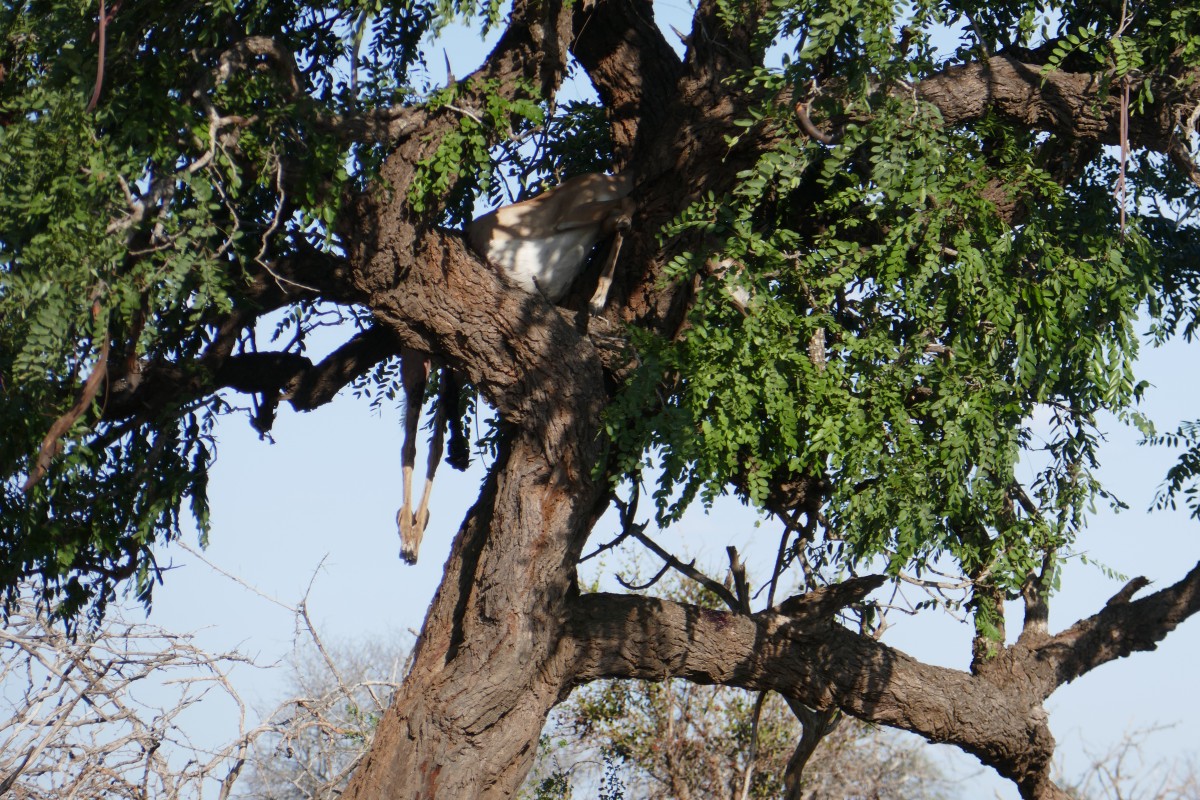 Ein totes Impala im Baum? Hier war ein Leopard am Werk. Leider war die große Katze selbst wohl gerade anderswo unterwegs.