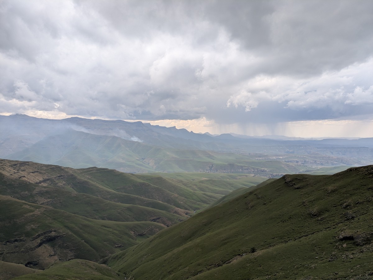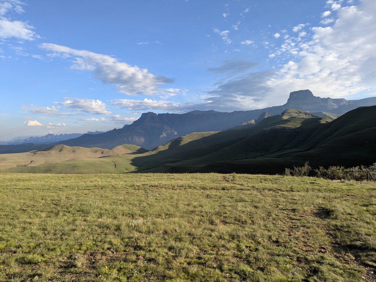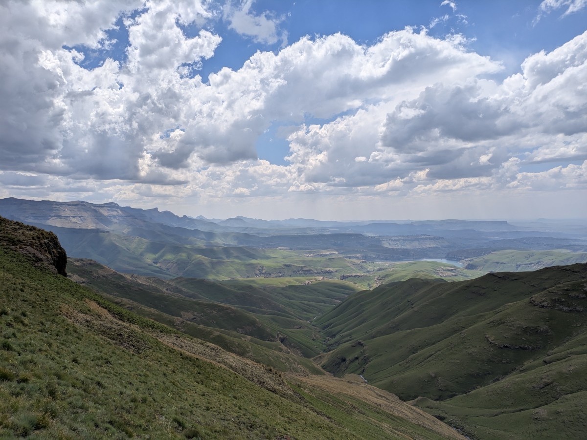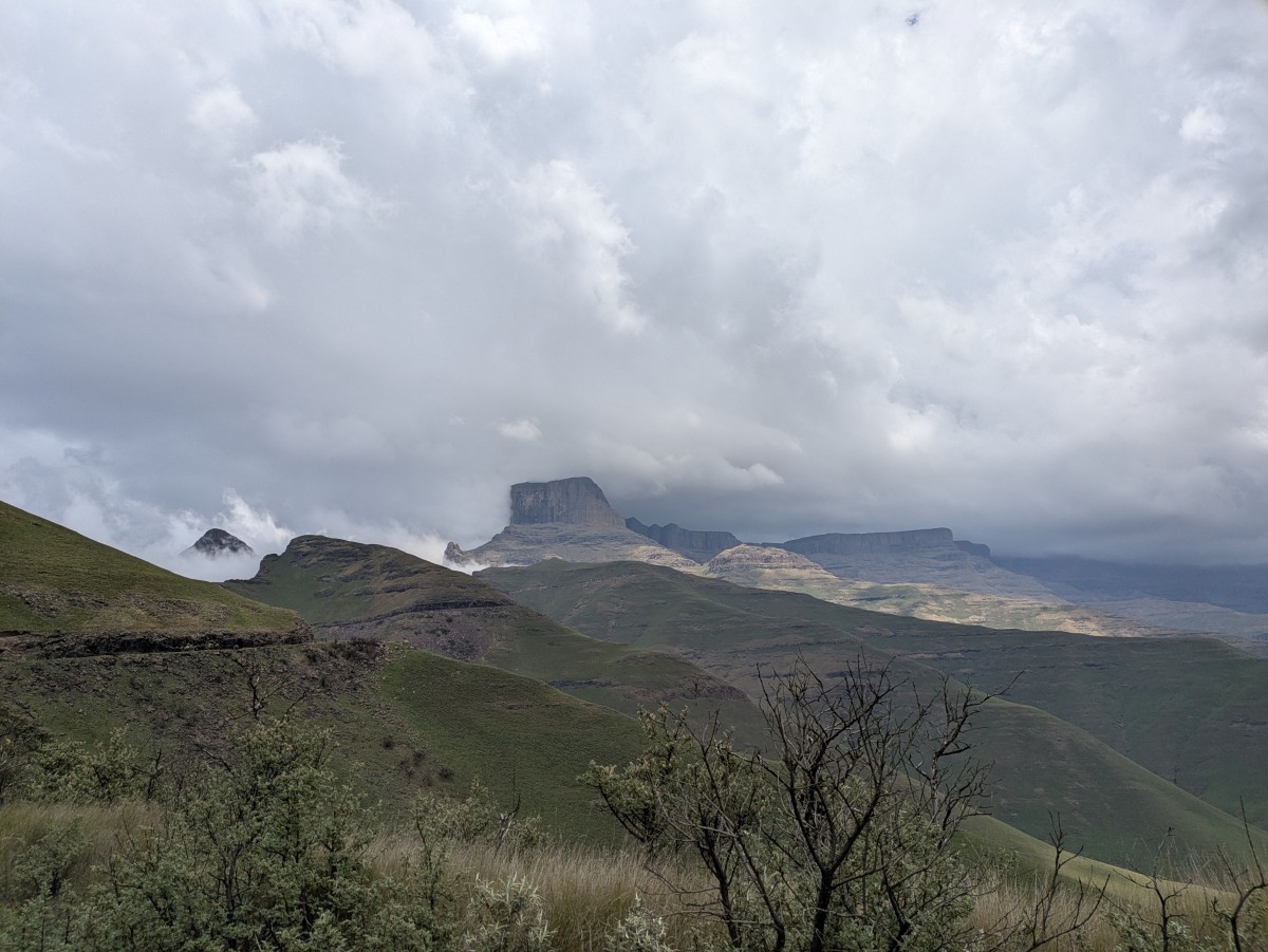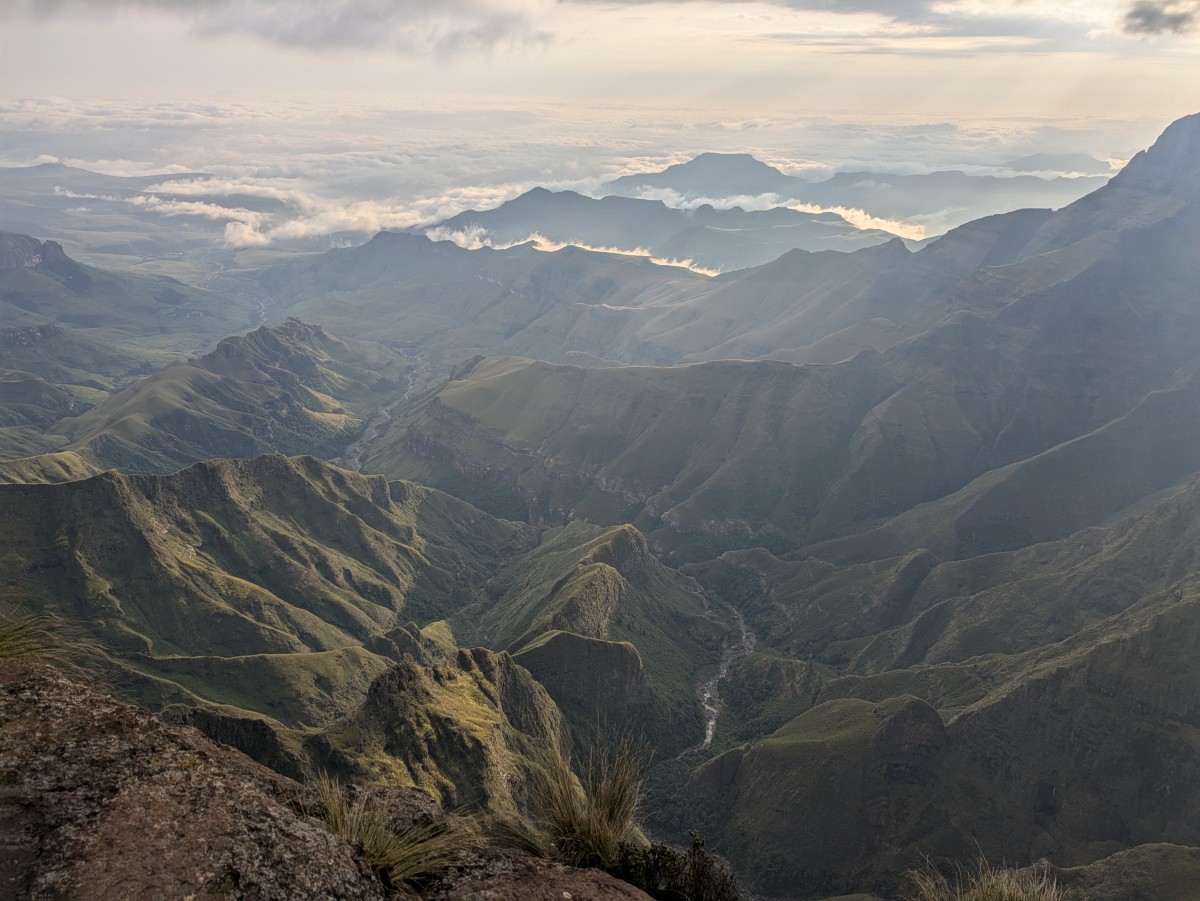 Welle um Welle branden die vorgelagerten Hügelketten gegen die Steilwände der Drakensberge. Einen ähnlichen Anblick, jedoch in trockenen Brauntönen, hatte ich am Jebel Shams im Oman - das deja vu drängt sich in meinen Kopf.