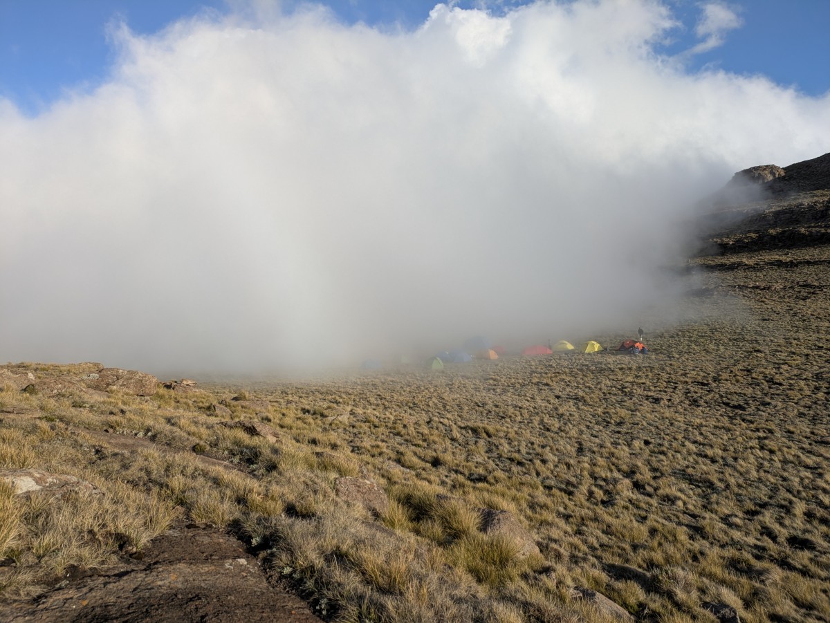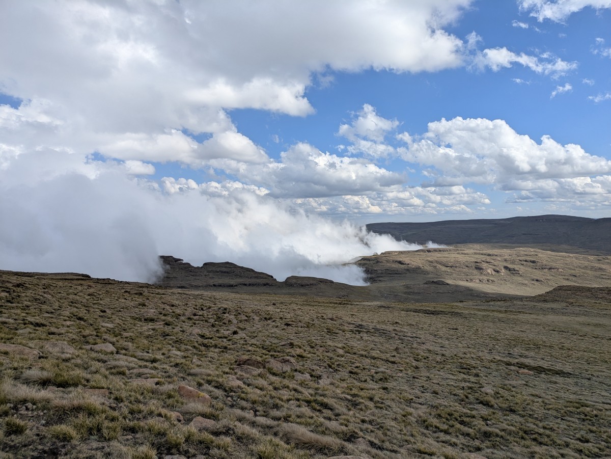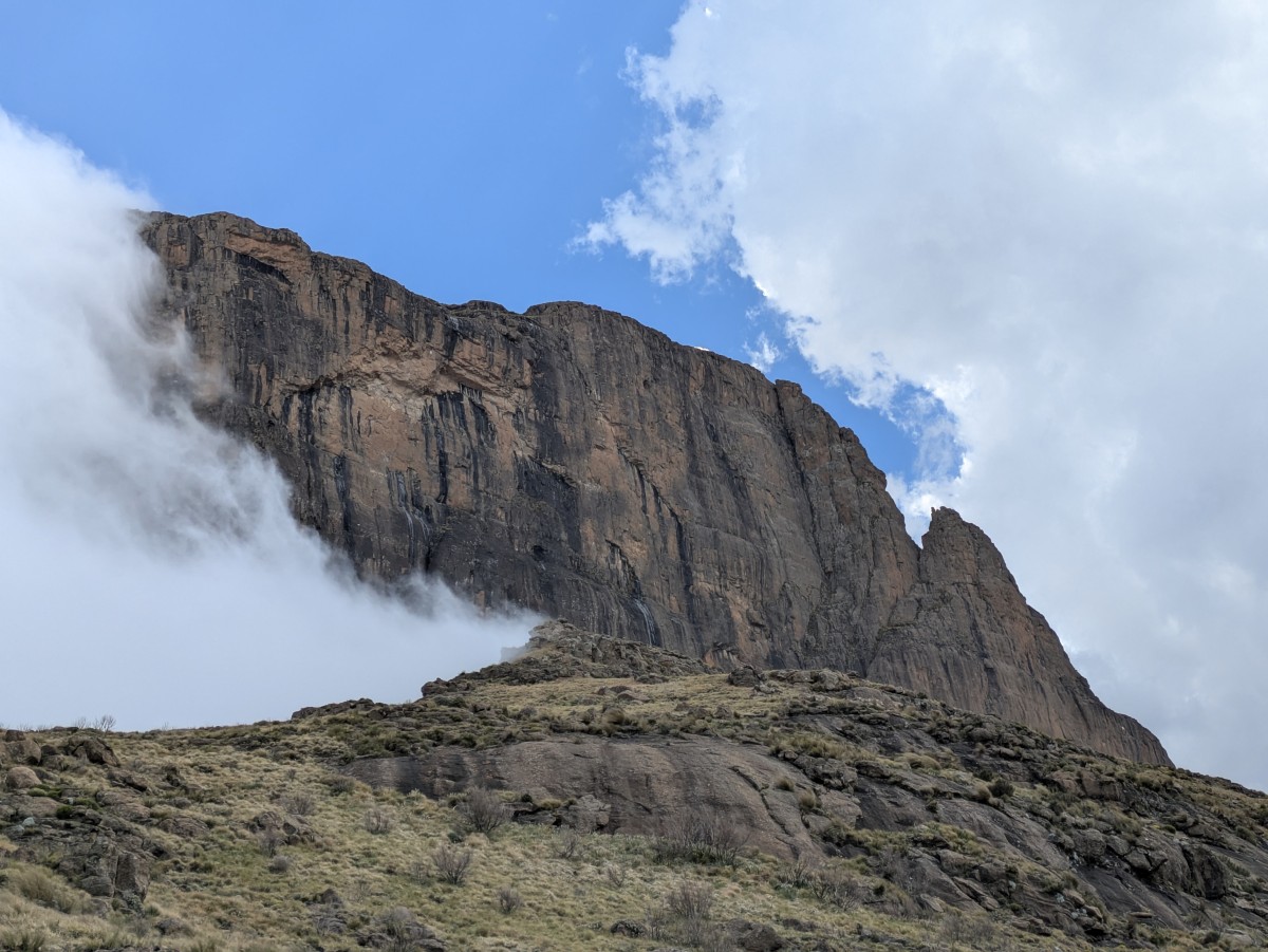 Am Nachmittag langen wir am Lagerplatz bei den Tugela-Wasserfällen an. Am Sentinel schwappen die Wolken nach oben.