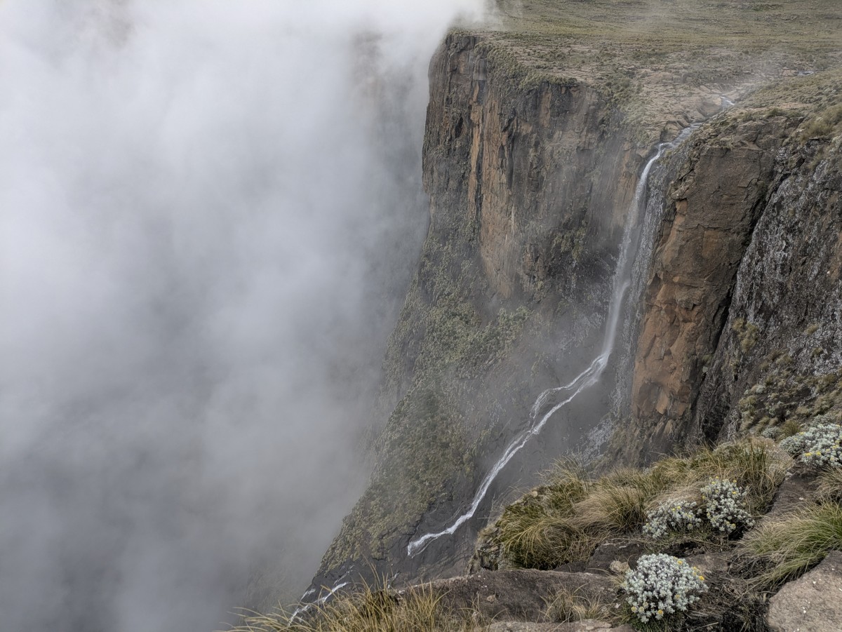 In einem einigermaßen wolkenfreien Augenblick gelingt mir ein Bild des Tugela-Wasserfalls; zumindest dessen oberen Teils. Insgesamt fällt das Wasser hier über 850 Meter nach unten.
