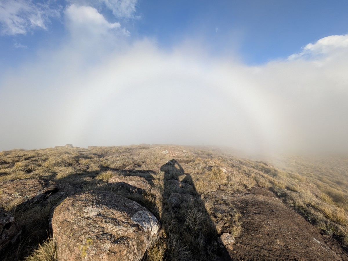 Ich genieße etwas oberhalb die schöne Nachmittagsstimmung und entdecke meinen Nebelbogen. Anders als bei einem Regenbogen oder einer Halo entsteht dieser rein weiße Bogen bei extrem kleinen Wasserpartikeln; ein Regenbogen oder eine normale Halo würde hingegen bei größeren Tröpfchen die bekannten fünf Farben aufzeigen.