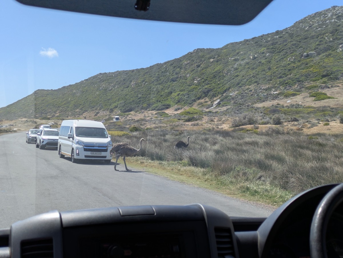 Von dort werden wir mit dem Kleinbus abgeholt und nach Kapstadt zurückgefahren. Ein Straußenpäärchen überquert die Straße.