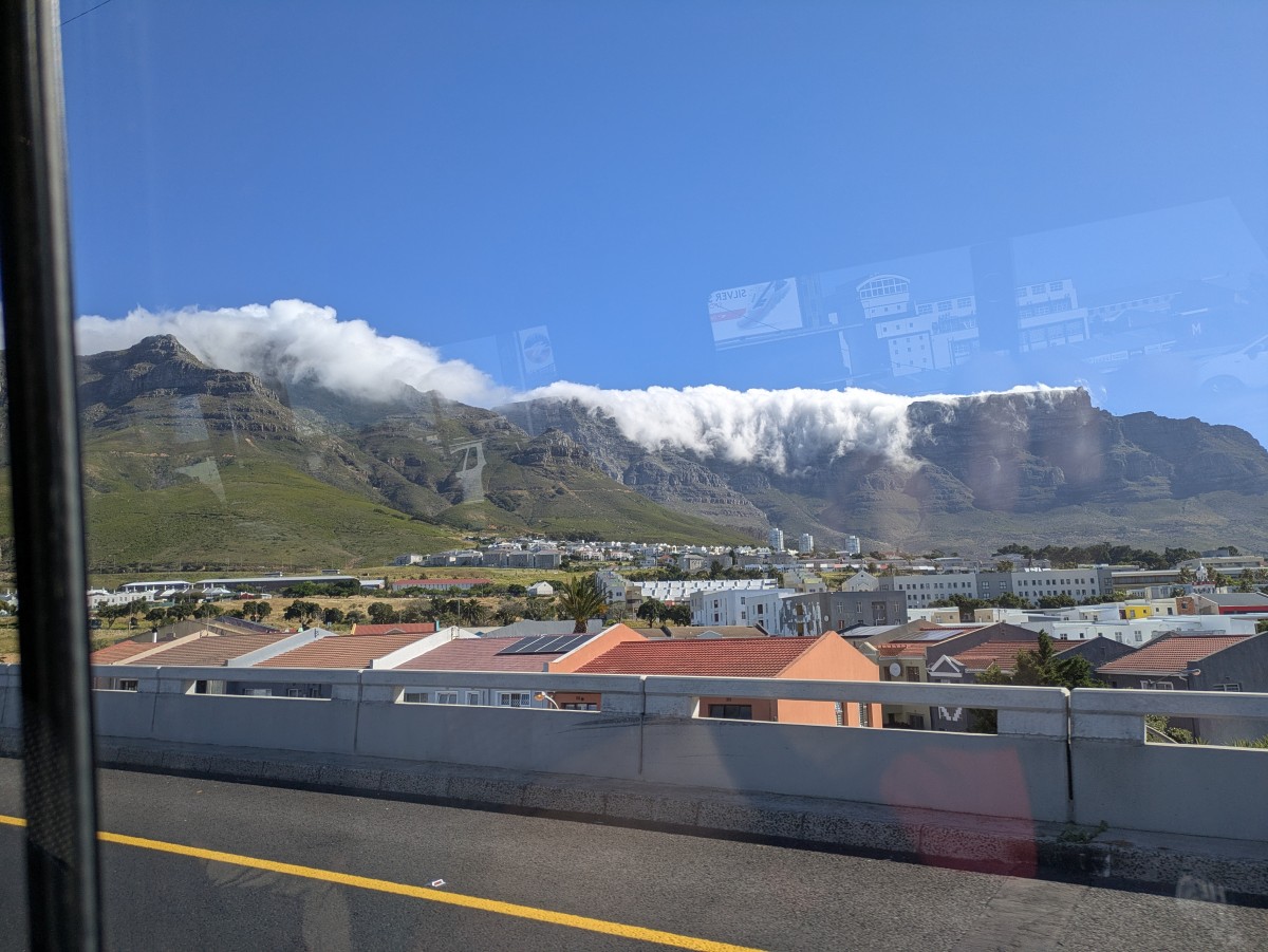 Bei der Fahrt ins Stadtzentrum mache ich einen Schnappschuß von den Wolkenmassen, die von Süden her über den Tafelberg herunterschwappen.